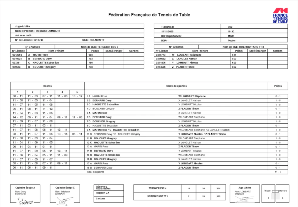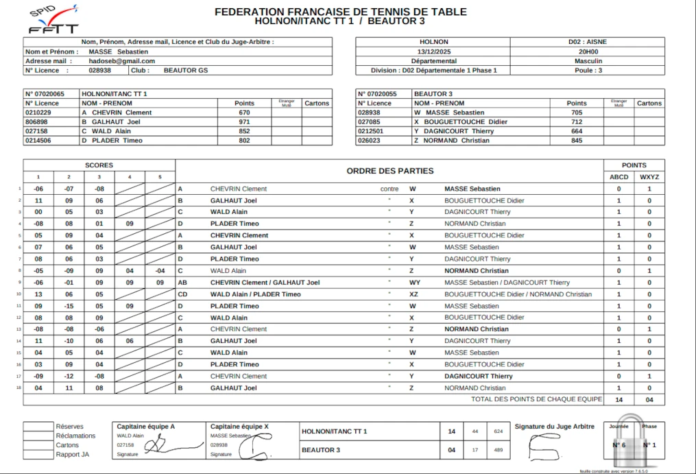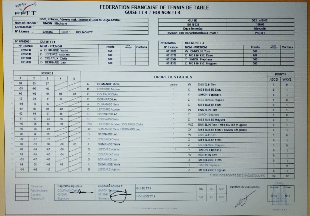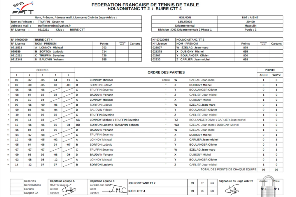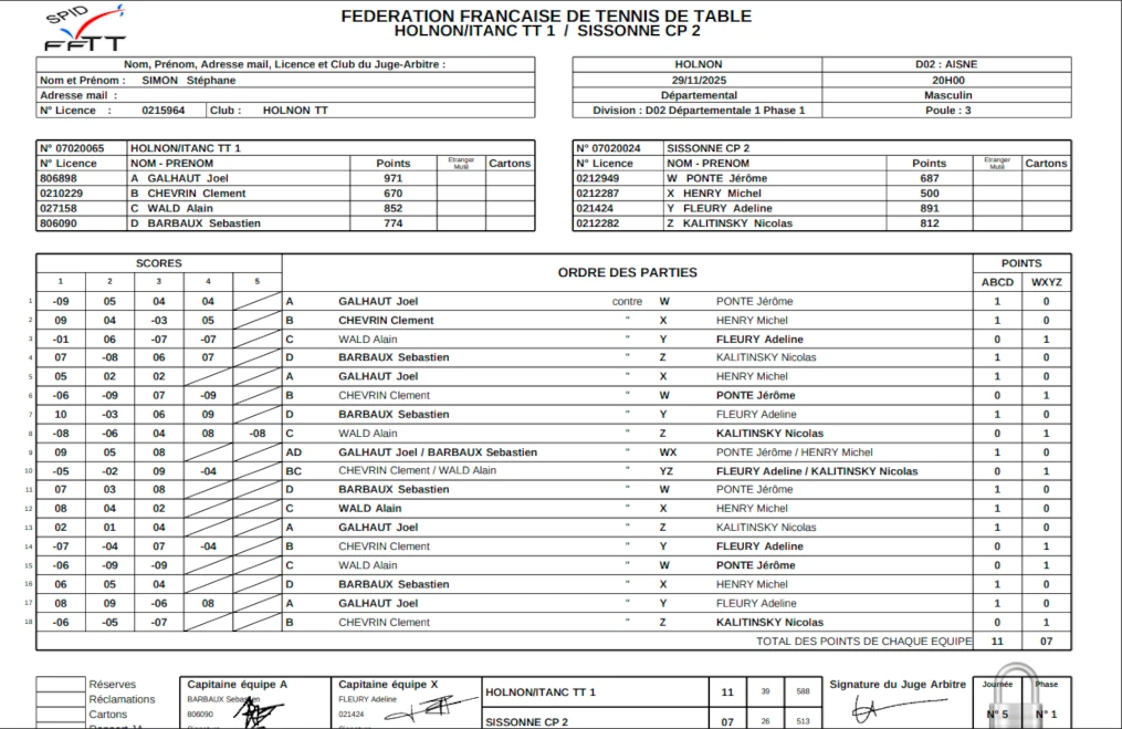 .En date du 22/11, la feuille de matchs n’était toujours pas disponible sur le site de la FFTT.