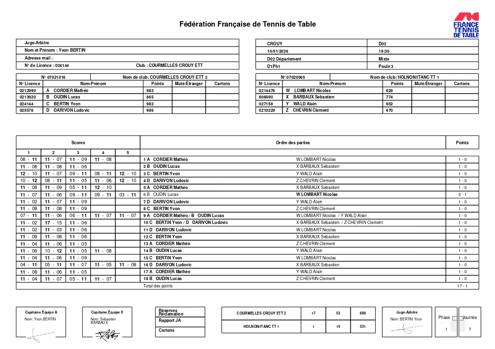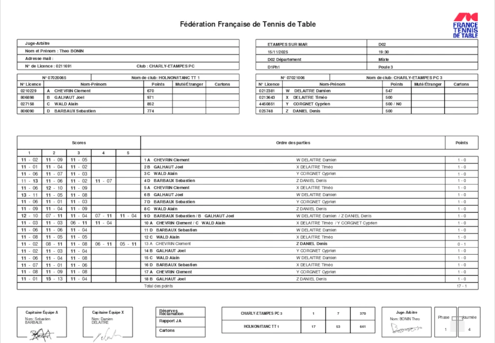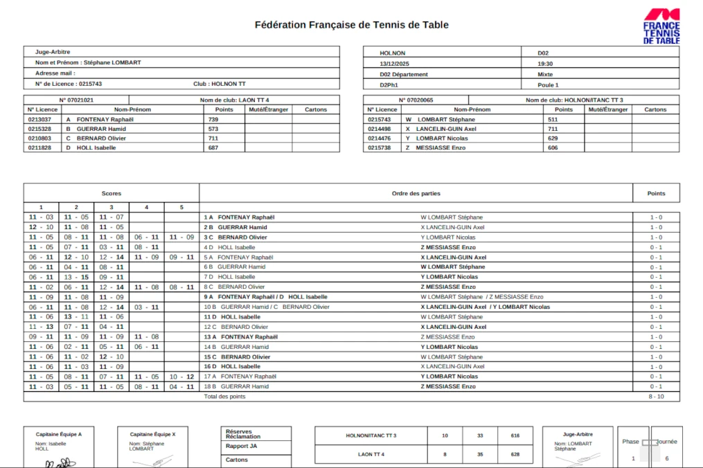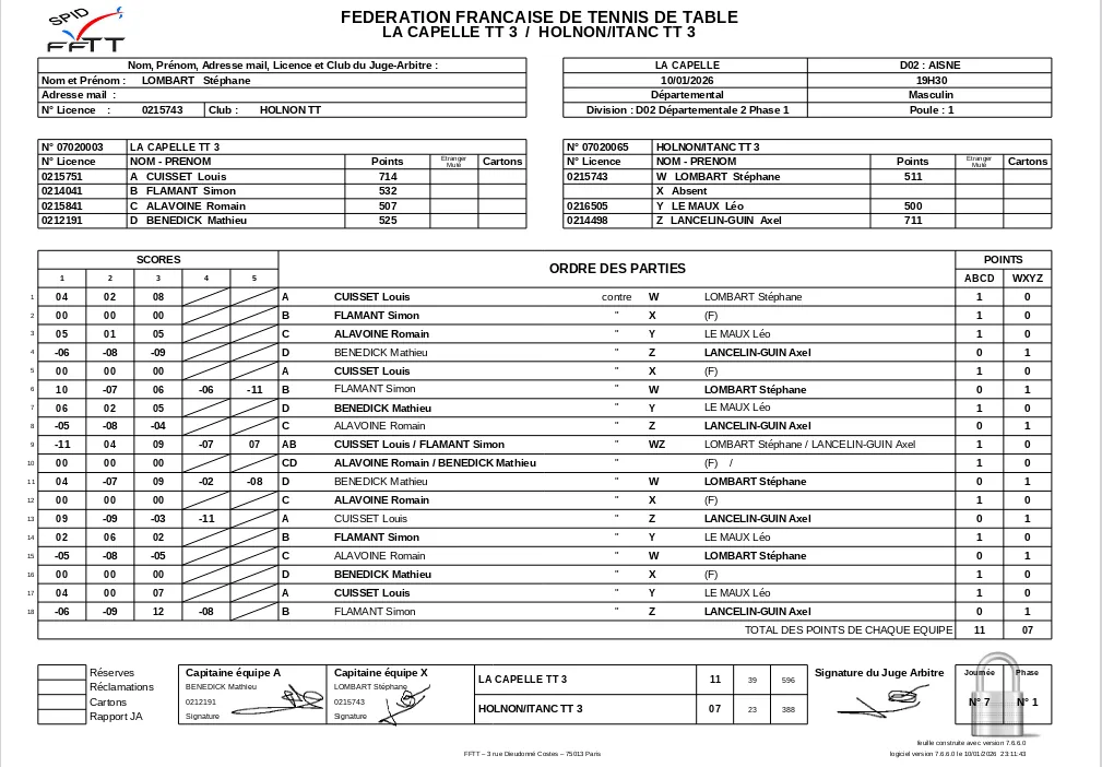 .En date du 22/11, la feuille de matchs n’était toujours pas disponible sur le site de la FFTT.