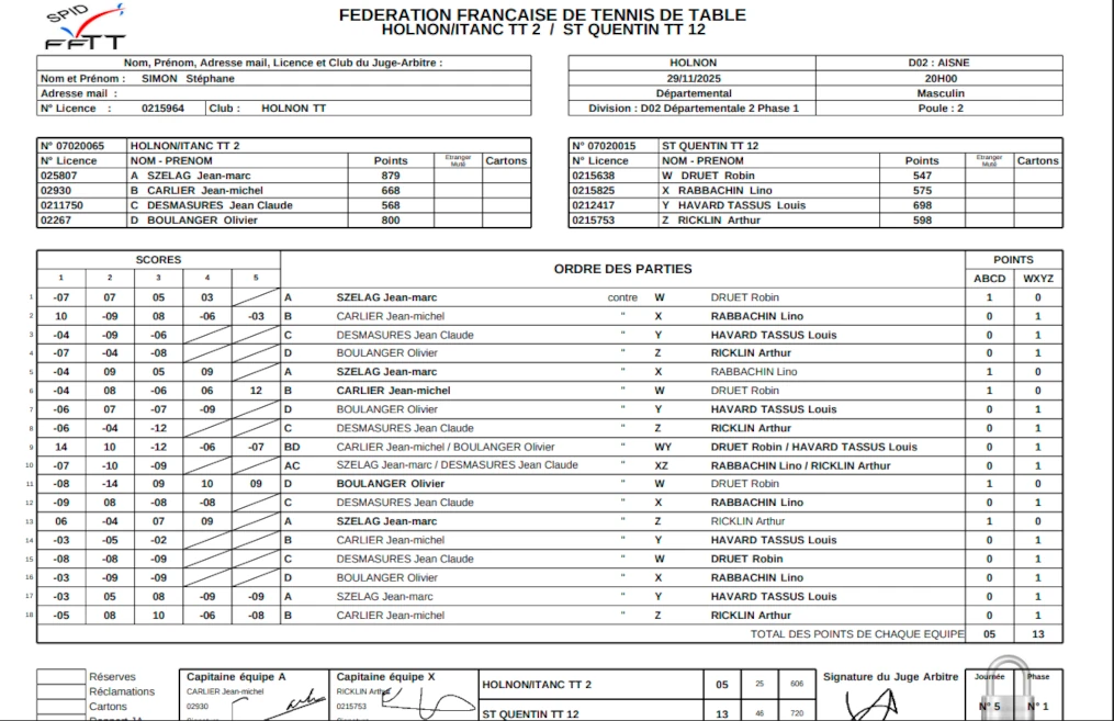 Le score : HolnonTT2 : 5 / St Quentin TT12 : 13