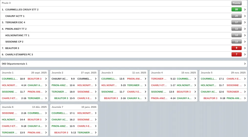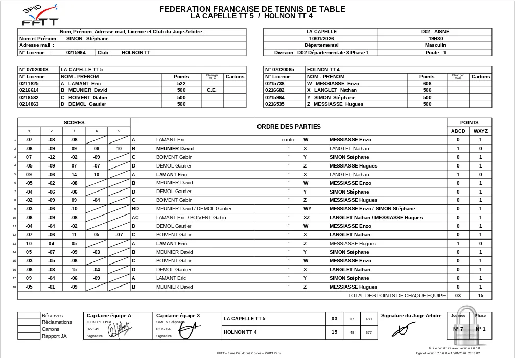 Le score, HolnonTT3 : 15 / Crépy TT3 : 3