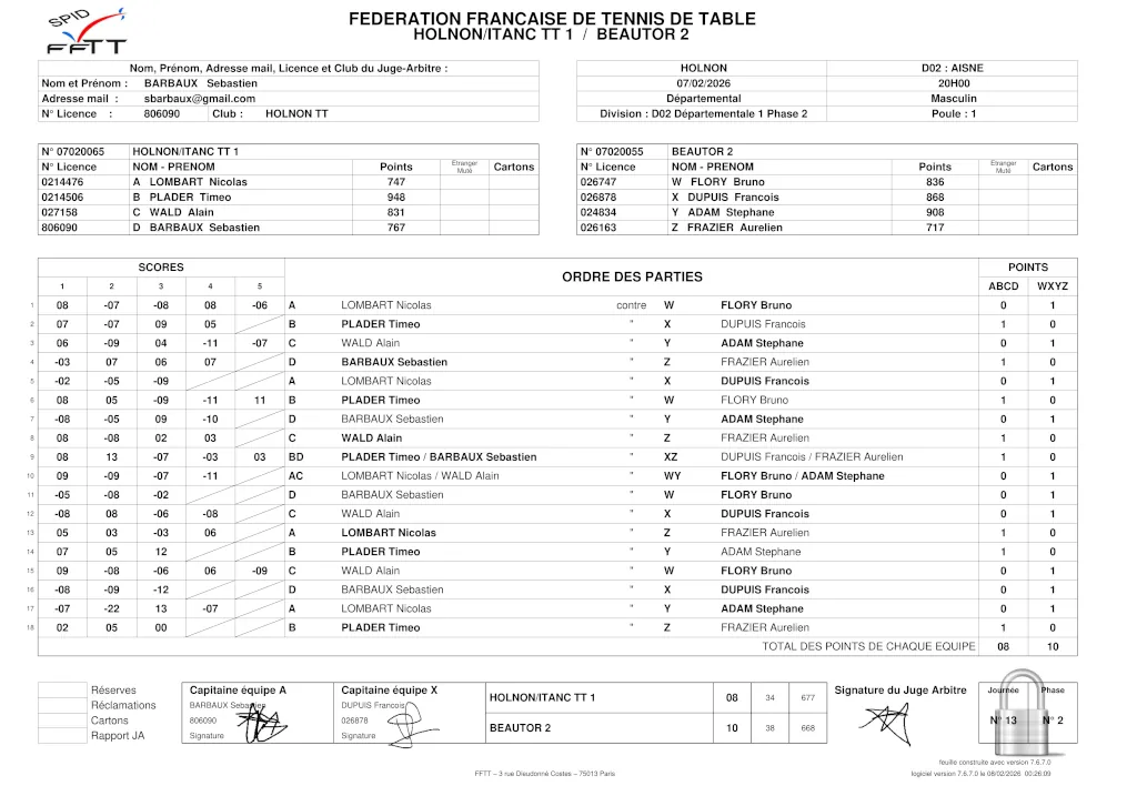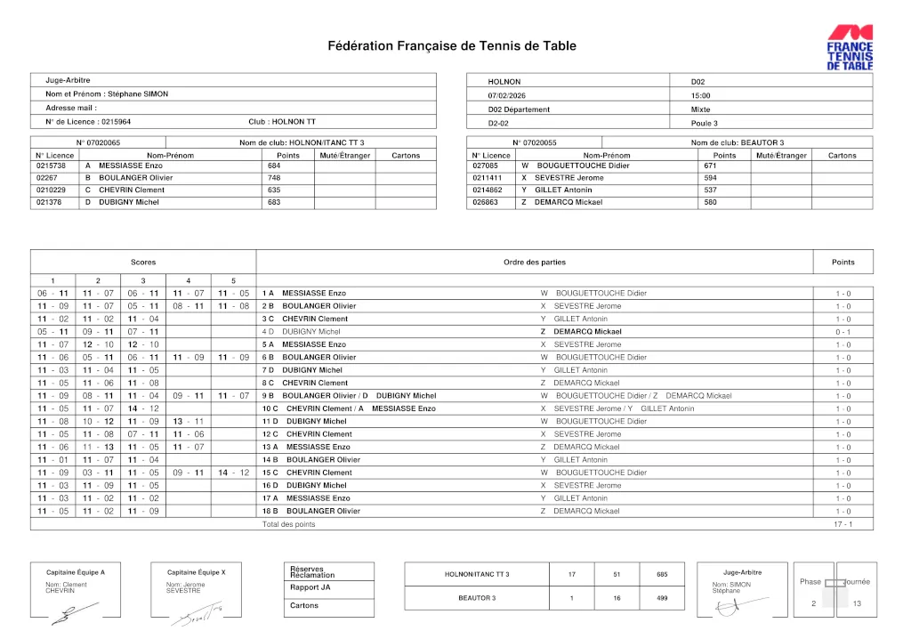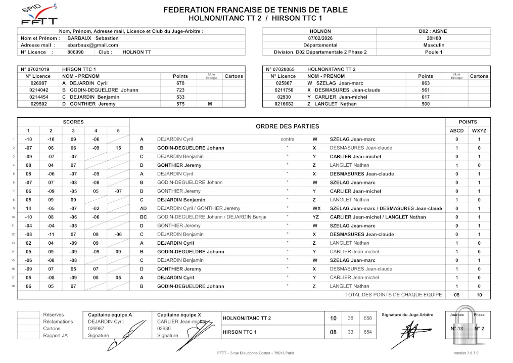 .En date du 22/11, la feuille de matchs n’était toujours pas disponible sur le site de la FFTT.