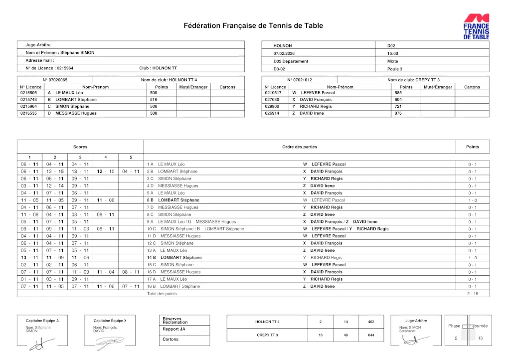 Le score, HolnonTT3 : 15 / Crépy TT3 : 3